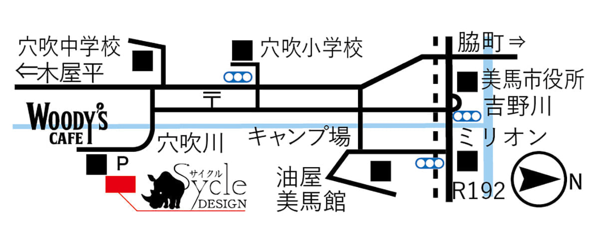 脇町方面からは、穴吹橋を渡り踏切を越え、穴吹中学校入り口を越えてすぐ左に入り、橋を渡りすぐ左の黒い建物です。