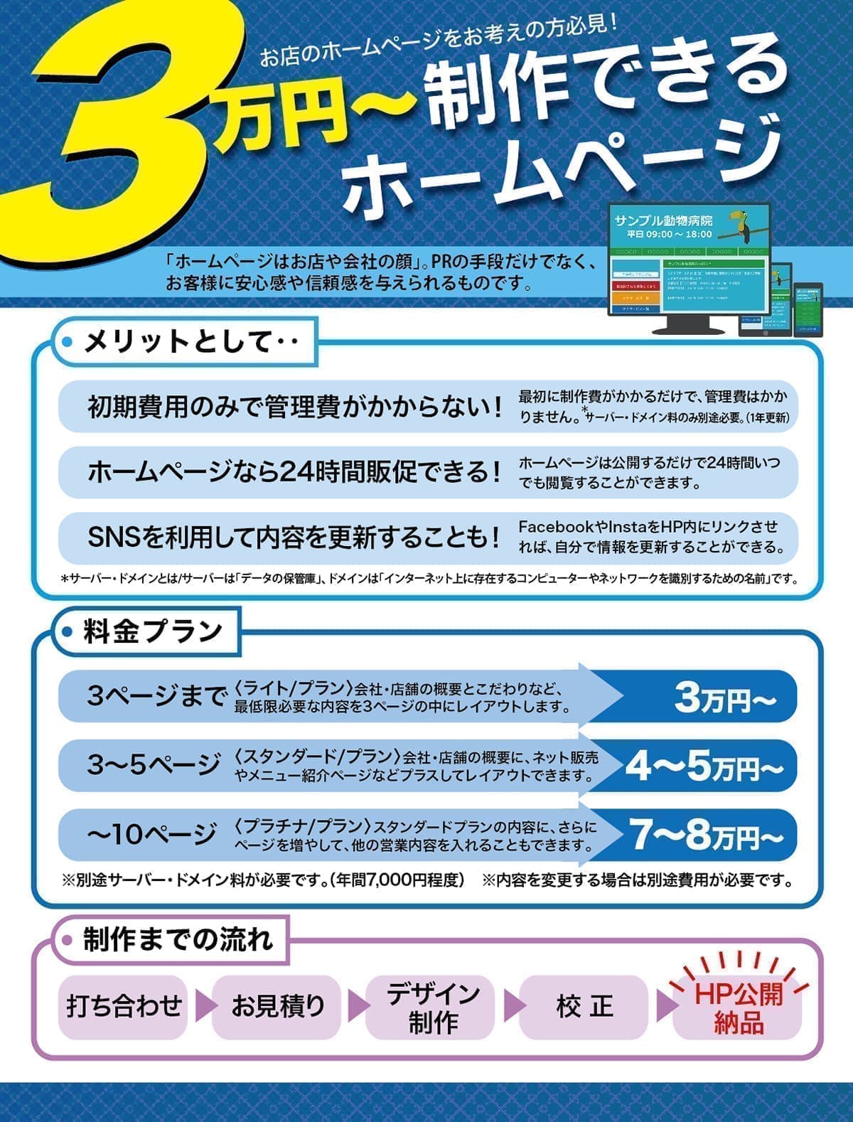 大きな企業でなくてもホームページは必要です。例えば名刺にホームページアドレス(QRコード)を入れることによって、会社や店舗案内パンフレットを作らなくてもホームページを見てもらえれば、パンフレットとしての販促効果がある。ウェブの特徴でもある不特定多数をターゲットにするのではなく(ネットショッピンサイトは別)地域の顧客をターゲットとするのであれば、ホームページは必要最小限の内容でも充分。制作費3万円〜プランは、個人事業主様にも今すぐ始められるホームページです。